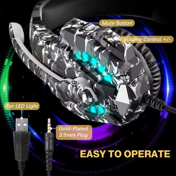 The built-in omnidirectional microphone delivers clear voice transmission, making team communication smooth and effective. Bright LED lights on the ear cups add a stylish gaming atmosphere, giving the headset a bold and professional look.